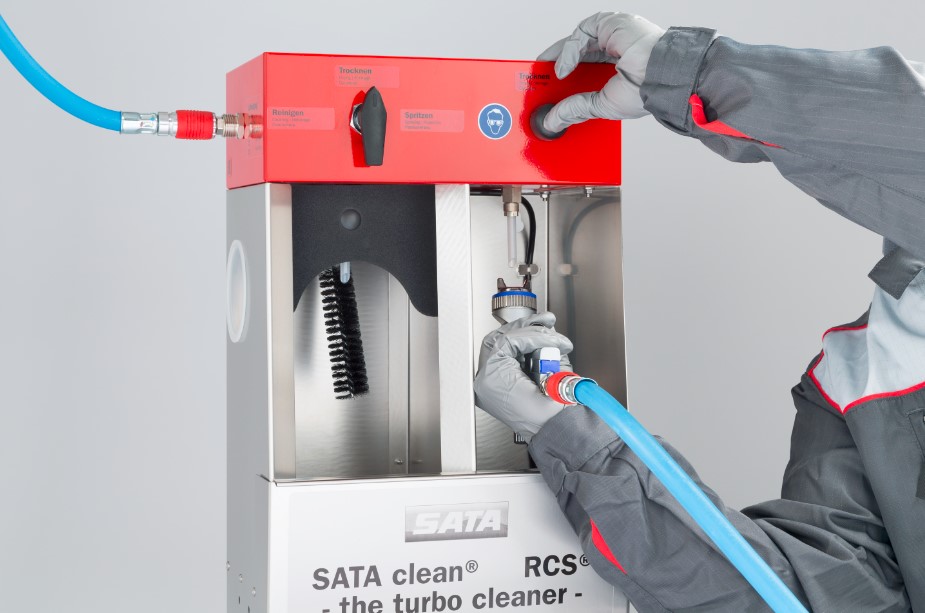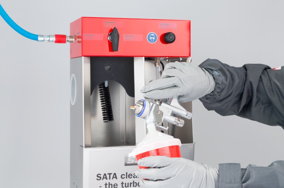噴槍清洗:噴槍保持與空氣管鏈接;“清洗”模式下,操作氣壓自動(dòng)將至最低,同時(shí)清潔劑混合氣泡從清洗噴嘴噴出,扣動(dòng)扳機,把噴槍涂料進(jìn)口放在清洗噴嘴下,來(lái)沖洗涂料通道,同時(shí)利用毛刷清洗風(fēng)帽及噴槍前端。