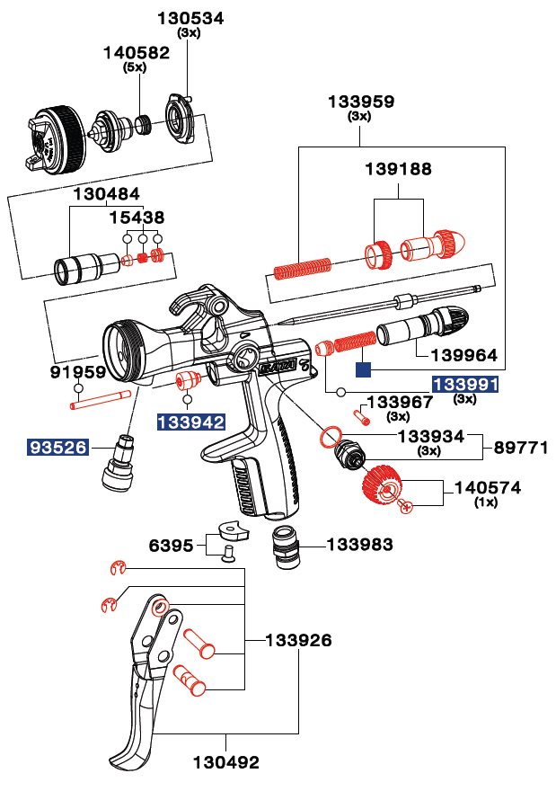 有紅、藍、綠、黑4種顏色的塑料墊,可配于槍尾,方便識別不同用途的噴槍。