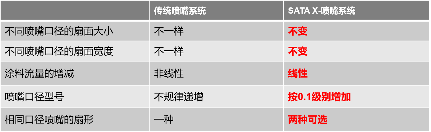 簡(jiǎn)單易明而符合邏輯的噴嘴系統與及一致的噴幅扇形,方便根據各自的要求而選擇,作較干或較濕的噴涂