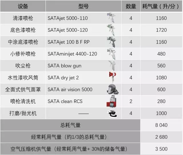 空氣壓縮機的設備銘牌上都有功率和排氣量這兩個(gè)參數,一般1 千瓦的螺桿式空氣壓縮機的產(chǎn)氣量為120 升/分~150 升/分,不同品牌和型號空氣壓縮機的參數也不盡相同,可根據空氣壓縮機廠(chǎng)商提供的數據來(lái)選擇。如果按照職業(yè)院校鈑噴實(shí)訓車(chē)間布置2個(gè)噴烤漆房和4個(gè)前處理工位,則應該選擇30 千瓦的螺桿式空氣壓縮機,其排氣量大于3500 升/分。