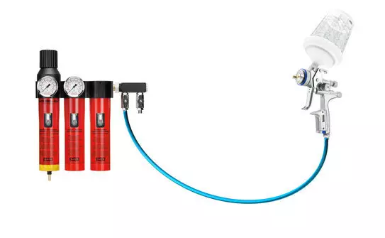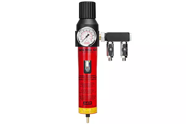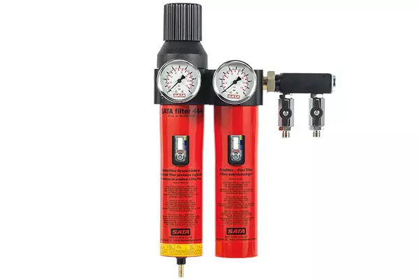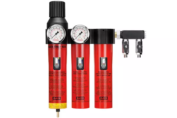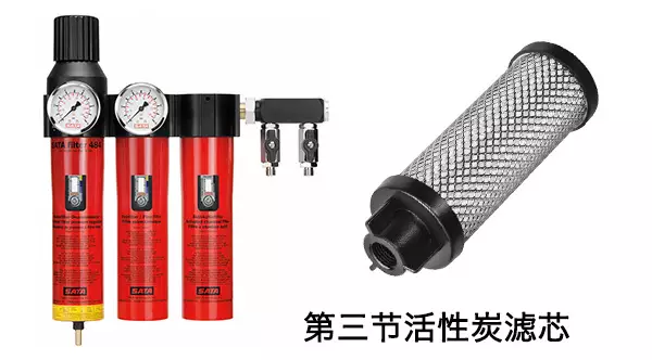 SATA filter 484三節油水分離器,不但具有SATA filter 424單節油水分離器和SATA filter 444雙節油水分離器的所有功能,還具有第三節活性炭過(guò)濾,能有效吸附壓縮空氣中殘余的油蒸氣,確保水性漆的噴涂質(zhì)量,當氣壓為600 kPa時(shí),其空氣流通量高達3600 L/min。