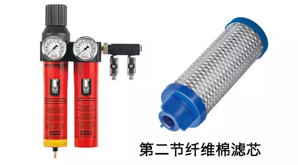 SATA filter 444雙節油水分離器除具有SATA filter 424單節油水分離器所有功能以外,其第2節濾芯采用纖維棉過(guò)濾材質(zhì),能有效過(guò)濾顆粒直徑為0.01 μm以上的物質(zhì),能大大減少涂層表面的顆粒物和其他雜質(zhì)。纖維棉濾芯的過(guò)濾面積約為300 cm2(面積是同類(lèi)設備的數倍),當氣壓為600 kPa 時(shí),其空氣流通量高達3600 L/min,可確保噴涂壓力的穩定性和底漆涂層厚度的均勻度。